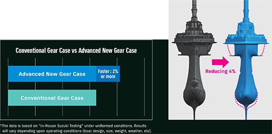 Since the gear case has reduced 4% of the frontal projected area, water resistance has decreased. This contributes to the better fuel efficiency.